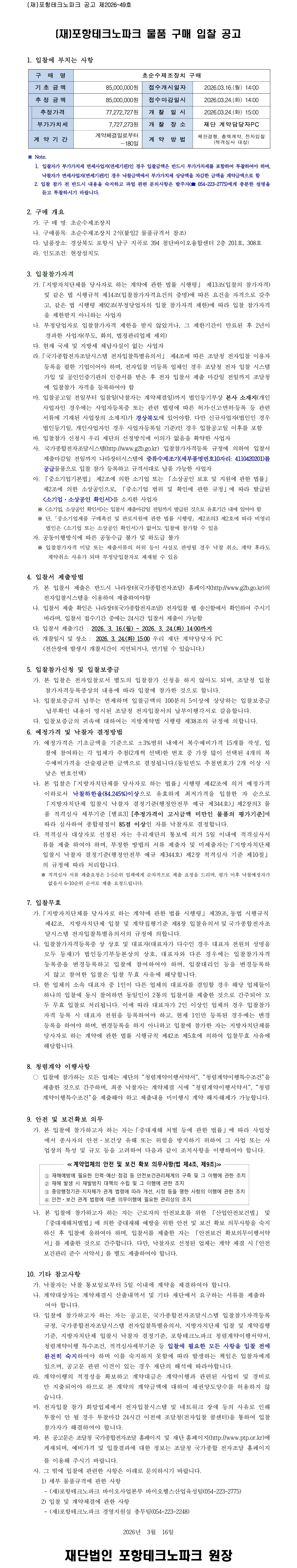 '초순수제조장치 구매' 입찰 공고