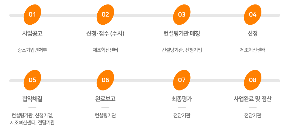 • 컨설팅기관 : 매칭과제에 대한 컨설팅 계획수립, 컨설팅 수행 및 결과 보고서 제출 등